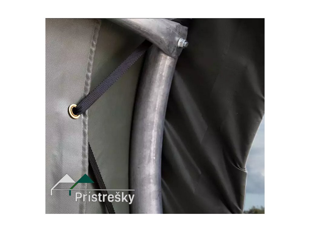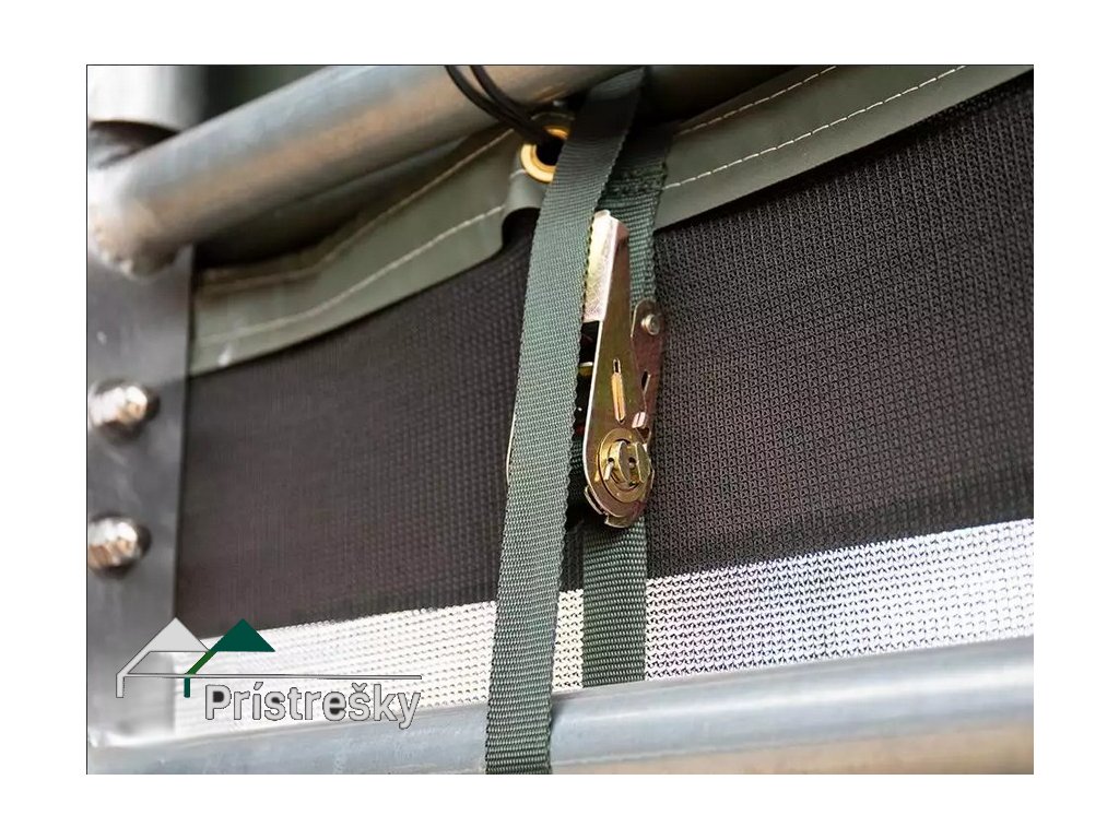 Veľmi vysoká stabilita vďaka dizajnu okrúhleho oblúka 10-ročná záruka proti prepichnutiu Ø kruhových oblúkov: 60 x 1,8 mm / Ø väznicových tyčí: 45 x 1,5 mm / Ø plotového rámu: 60 x 1,5 mm Plachta sa ľahko a presne natiahne cez oceľovú konštrukciu pomocou račňových napínačov Flexibilný a transportne optimalizovaný dizajn umožňuje jednoduchú montáž a prepravu Jednoduchý systém zástrčiek a skrutiek Stabilná konštrukcia a bezpečné pripevnenie k zemi pomocou robustných kolíkov alebo kotiev do betónu.