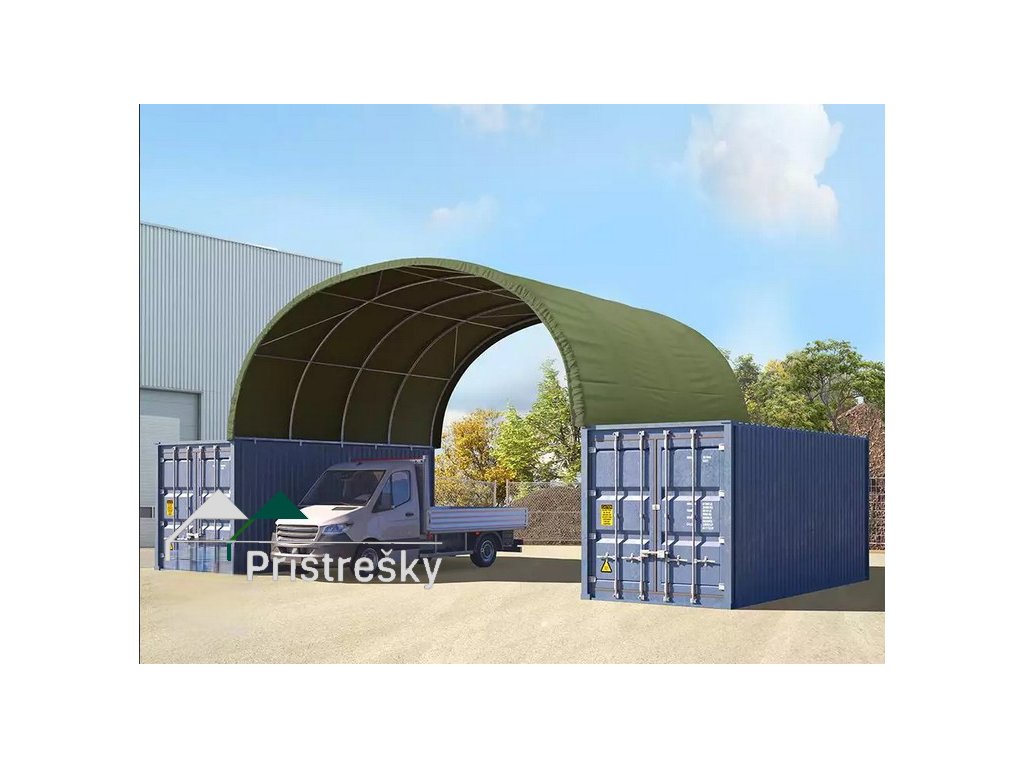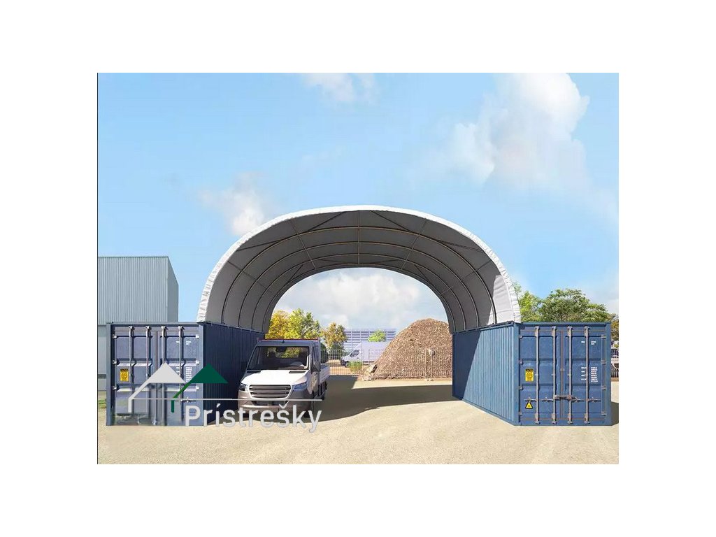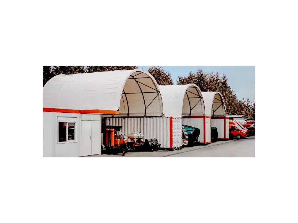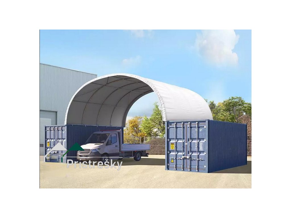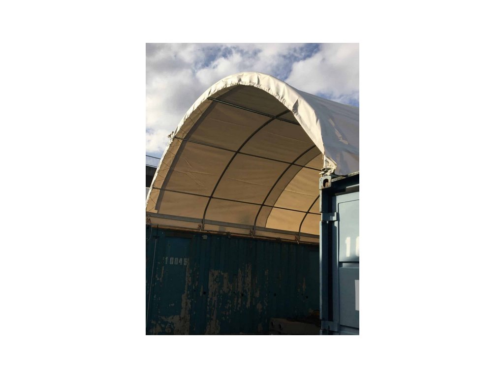 Táto stabilná kontajnerová strecha s odskúšanou statikou je vhodná napríklad na trvalé použitie na kontajneroch a silách. Zaoblená konštrukcia kontajnerového stanu znižuje vplyv síl a zvyšuje stabilitu. Všetky spojovacie prvky sú vyrobené z nehrdzavejúcej, plne pozinkovanej ocele. Pri montáži sa komponenty zasunú do seba a zoskrutkujú. Plachta je vyrobená z robustného PE materiálu s hmotnosťou cca 350 g/m² a je upevnená na tyčovej konštrukcii sofistikovaným napínacím systémom. Materiál PE plachty je 100% vodeodolný a ponúka vysokú UV ochranu 80+. Skladovaný tovar a stroje sú tak účinne chránené pred slnkom a zrážkami